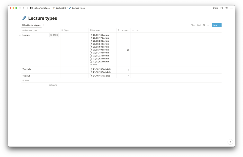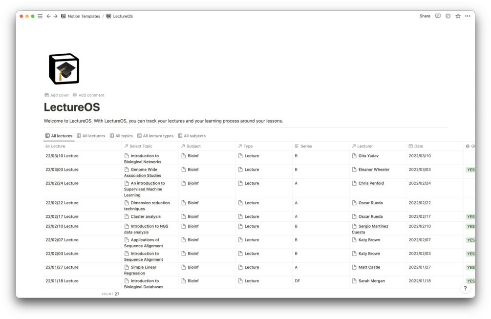 You'll get all the templates you need to track your lectures, lecturers, lecture topics, subjects and more.